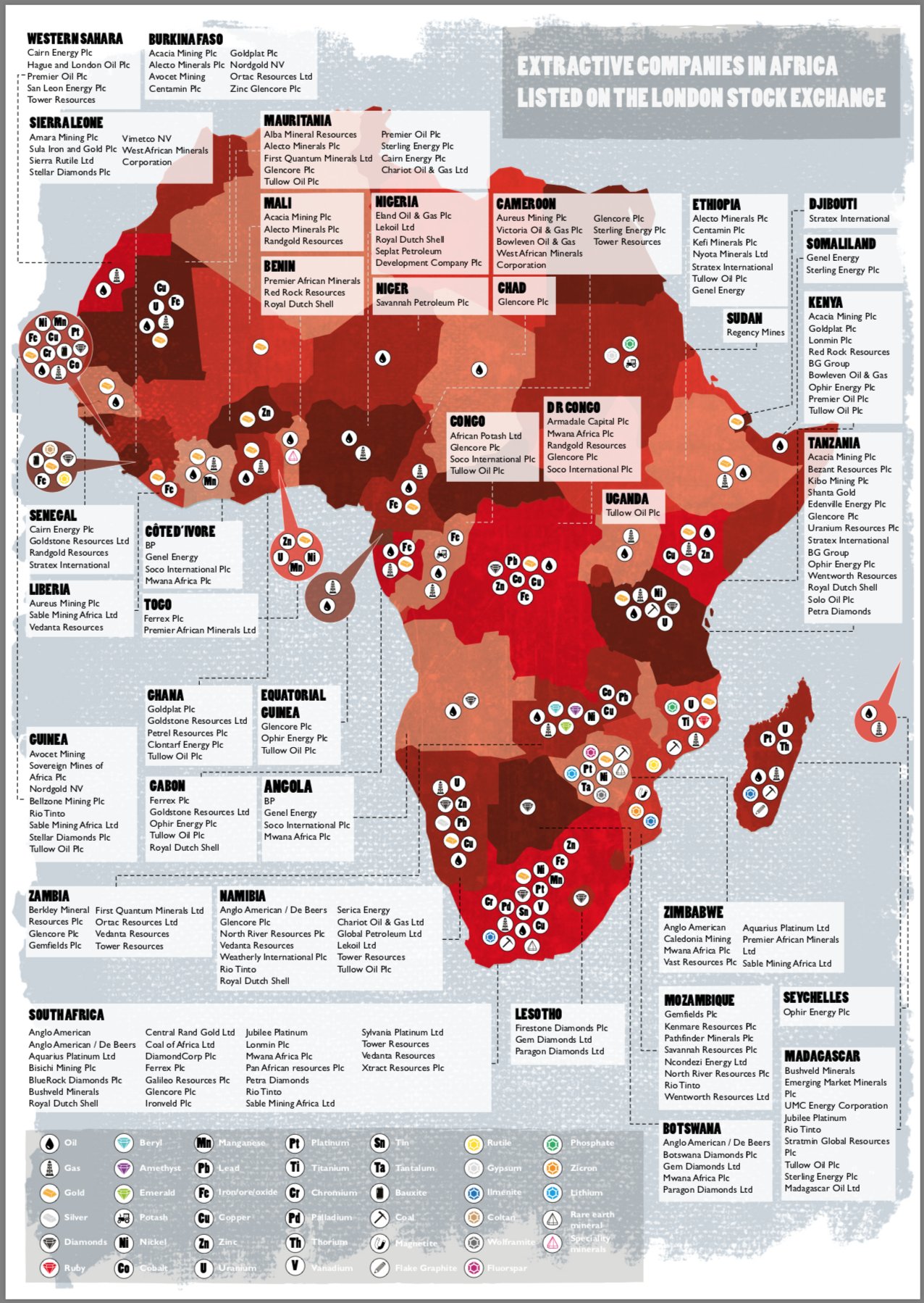 Αυτές οι εταιρείες έχουν δραστηριότητες εξόρυξης σε περισσότερες από 37 χώρες στην ήπειρο και 59 είναι εγκατεστημένες στο Ηνωμένο Βασίλειο, ενώ 12 έχουν ενσωματωθεί σε βρετανικούς φορολογικούς παραδείσους....Και σκεφτείτε πως έχει και χειρότερο : η βρετανική κυβέρνηση επιτρέπει την εκμετάλλευση χρησιμοποιώντας την πολιτική της βαρύτητα για να πιέσει τις αφρικανικές χώρες να υιοθετήσουν πολιτικές που είναι ευνοϊκές για τα βρετανικά συμφέροντα. Είναι μια αξιοθρήνητη επανάληψη της αποικιοκρατίας.