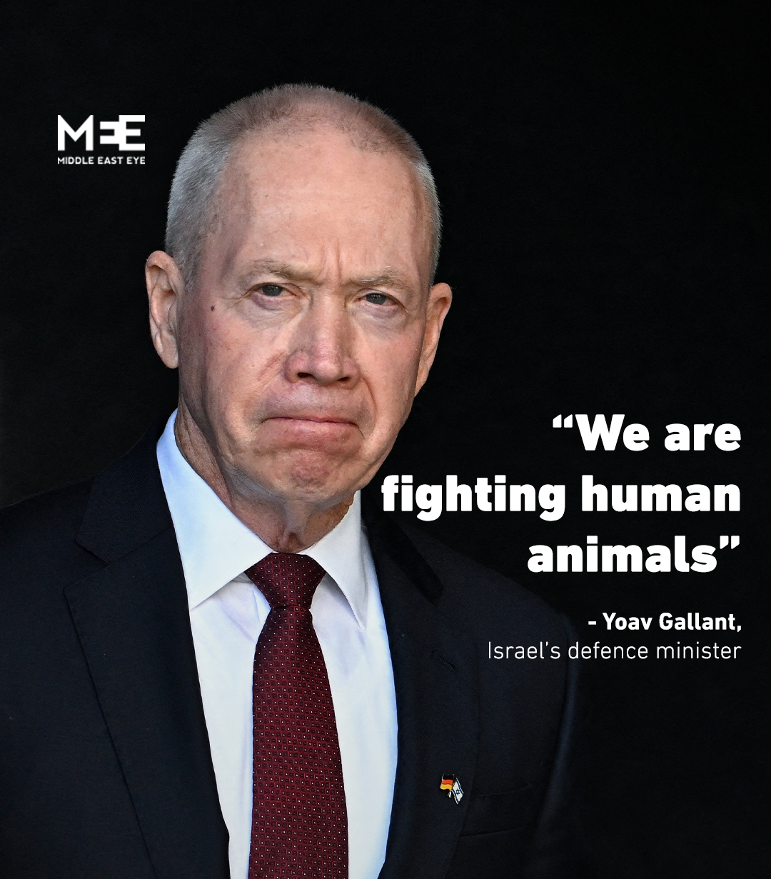 Ο πρωθυπουργός Μπέντζαμιν Νετανιάχου ταύτισε τη Γάζα με τον Αμαλήκ , ένα έθνος εχθρικό προς τους Ισραηλίτες στη Βίβλο, και ανέφερε τη Βιβλική εντολή να σκοτώσει κάθε άνδρα, γυναίκα, παιδί ή ζώο των Αμαλέκων. Ο υπουργός Άμυνας Yoav Gallant ( φωτό ἀριστερά) αποκάλεσε τους Παλαιστίνιους « ανθρώπινα ζώα ».Ο Ισραηλινός Πρόεδρος Isaac Herzog δήλωσε, όπως είπαν οι νοτιοαφρικανοί δικηγόροι στο δικαστήριο, ότι όλοι στη Γάζα είναι υπεύθυνοι για αυτό που συνέβη στις 7 Οκτωβρίου επειδή ψήφισαν υπέρ της Χαμάς, αν και ο μισός πληθυσμός στη Γάζα είναι παιδιά πολύ μικρά για να ψηφίσουν. Αλλά ακόμα κι αν ολόκληρος ο πληθυσμός της Γάζας ψήφισε υπέρ της Χαμάς, αυτό δεν την καθιστά νόμιμο στρατιωτικό στόχο. Εξακολουθούν να είναι, υπό τους κανόνες του πολέμου, πολίτες και δικαιούνται προστασία. Έχουν επίσης το δικαίωμα σύμφωνα με το διεθνές δίκαιο να αντισταθούν στην κατοχή τους μέσω ένοπλων αγώνων.