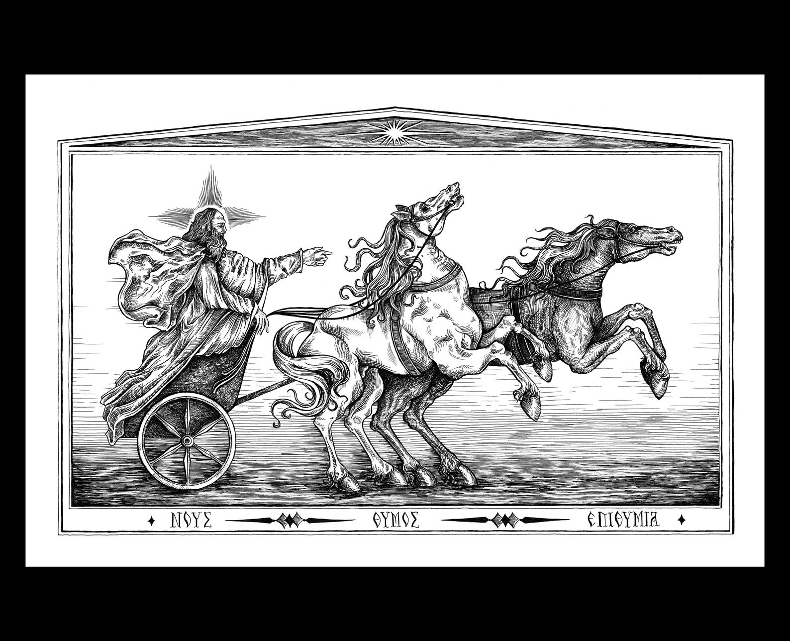 Ας παρομοιάσουμε την ψυχή με τη συνδυασμένη δύναμη ενός φτερωτού ζεύγους αλόγων και ενός ηνίοχου. Στην περίπτωση των θεών, τόσο τα άλογα όσο και οι ηνίοχοι είναι ευγενείς και γεννημένοι από τους ευγενείς, ενώ σε άλλες περιπτώσεις έχουν ανάμεικτη καταγωγή.